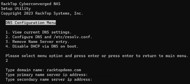 - Select option 2 Configure DNS and /etc/resolv.conf. Follow the prompts to configure DNS.