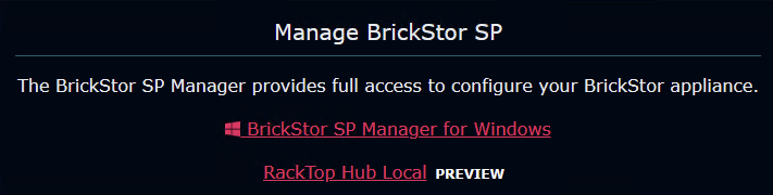 - At the bottom of the page under Manage BrickStor SP section, select RackTop Hub Local.