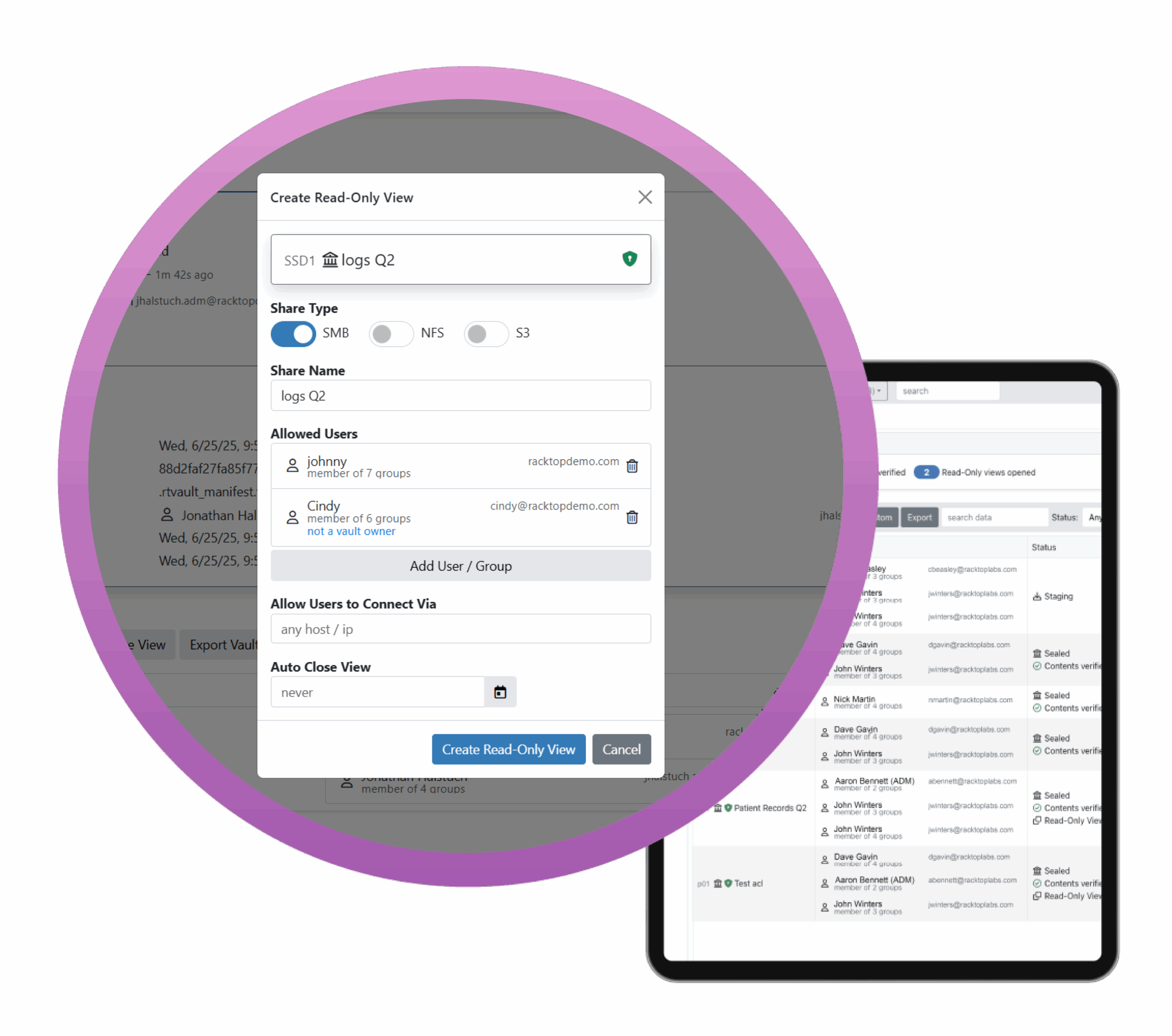 Once a vault is sealed, the only way to access its contents is through a view via RackTop’s digital twin technology. Data owners can instantly “twin” an existing vault and share it over common network protocols like NFS and SMB to a targeted set of users, groups, or systems. The original vault data is never accessed. Only the digital twin, which is an instant zero-copy clone of the vault’s data, is available to be accessed. Vault views are governed by policy as well, so vaulted data can be exposed for any length desired and only to users, hosts, and networks associated with that twin’s view.